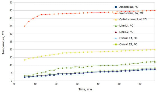 Based on the gathered data, a graph illustrating the temporal temperature distribution on the heating plate (lines L1–L4) and across the entire surface of the plate (El1) was created, as depicted in Figure 8.