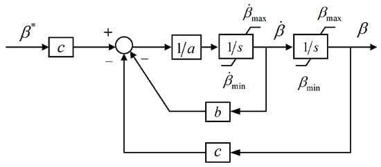 The pitch angle of the wind turbine is adjustable for limiting turbine rotor speed and, thus, mechanical power outputs. Figure 3 illustrates a second-order pitch actuator model [28], acting on the pitch angle reference (), which is set by the proposed control module, with a, b, and c representing the model parameters. Also, the threshold values for both the pitch angle and the rate of its change are specified.