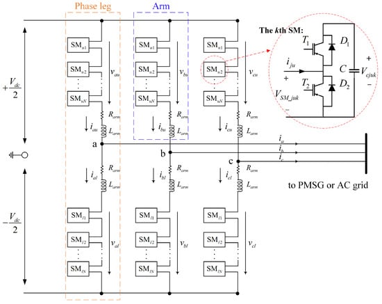 The generalized circuit configuration of a three-phase MMC is shown in Figure 4. The three-phase AC system (PMSG or AC grid) is connected to the midpoint of each phase leg. One leg consists of two arms, and each arm has a group of submodules (SMs), with an arm inductor () and an arm resistor () connected in series. The arm inductors are utilized to limit circulating currents among the phase legs and also DC-side short-circuit fault currents. For its simplicity, the two-level half bridge is chosen as the SM configuration in this work. Depending on the operating conditions, the individual voltages of the capacitors in the SMs can be inserted or bypassed by appropriately controlling the switches in the SMs to generate the desired output voltage waveforms.