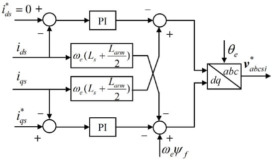 The MSC is responsible for regulating the DC-link voltage () at its nominal value, achieved using the cascaded proportional–integral (PI) control, as depicted in Figure 1. The outer voltage control produces the q-axis current reference () for the inner current control loop, with its detailed diagram shown in Figure 5, where the zero d-axis current (ZDC) control strategy [29] is applied. The decoupled control of the PMSG is analogous to a separately excited DC machine such that the electromagnetic torque () is directly controlled by the stator current. Moreover, the stator winding resistance is ignored in this control loop because it is generally negligible in high-power SGs. Lastly, the three-phase reference voltage component () is obtained through the inverse Park transform, based on the measured PMSG electrical rotor angle .