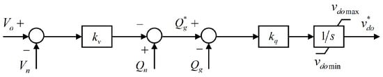 The GSC primarily performs reactive power control and VSG-based grid-forming functionality. Figure 6 shows the reactive power control, which mimics the conventional SG exciter and controls the measured reactive power output () based on the output phase voltage magnitude calculated as . and are the nominal output phase voltage and reactive power, respectively. is set as zero because additional reactive power support is unnecessary for nominal grid voltage. In addition, is a voltage droop coefficient, and the integral term introduces virtual inertia. This reactive power control loop provides the d-axis voltage reference () to the dual control module in Figure 1.