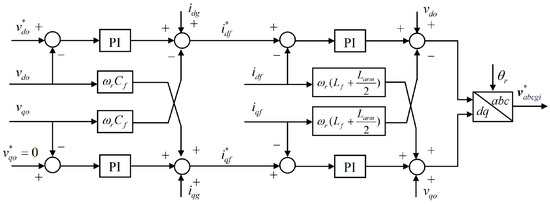 The dual control loop in the dq-axes reference frame is adopted due to its fast dynamic response and ability to limit grid fault currents. Similar to the MSC, it consists of an outer voltage control and an inner current control. In Figure 7, the outer voltage control loop tracks the voltage references ( and ) and generates the dq-axes current references ( and ) for the inner current control loop. Since the output voltage is aligned with the d axis of its reference frame, is set as zero. Furthermore, resistances are not considered within this dual control loop, given their negligible values. To generate the three-phase reference voltage component (), the inverse Park transform is utilized. The phase angle is provided by the VSG.