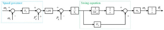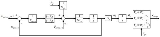 To analyze the frequency regulation capability of GFM control, it is essential to simulate an AC grid with inherent dynamics that could be effectively represented by an equivalent SG [18]. The AC grid in Figure 1 is then modeled as a controlled voltage source behind the grid impedance. The three-phase grid voltage reference is generated from the speed droop control for the equivalent SG [33], with its simplified block diagram illustrated in Figure 10.