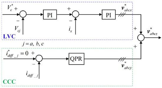The ancillary controls, namely SM capacitor voltage control (SCVC) and circulating current control (CCC), are common to both MMCs in the MSC and GSC. Since the SMs have floating capacitors, their voltages must be maintained at the nominal value (). Therefore, SCVC is essential for ensuring MMC’s stable operation and improving power quality. SCVC has two control levels: arm voltage control, which balances the SMs within one arm, and leg voltage control (LVC), which regulates the average SM capacitor voltage across each phase leg to the nominal value. This work employs the aggregate model of the half-bridge MMC [31] to reduce simulation burdens. All SM capacitor voltages in one arm are assumed to be balanced via arm voltage control strategies such as [32], so only LVC is implemented in this paper.