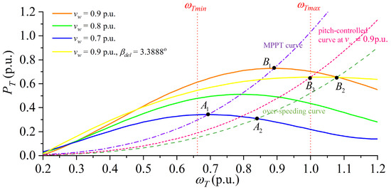 At relatively lower wind speeds (e.g., ), there is sufficient headroom between point on the MPPT curve and the maximum allowable rotor speed . Hence, the corresponding point on the designed over-speeding curve is reachable. Nevertheless, as Figure 11 suggests, this headroom diminishes with wind speed increase. When wind speeds are at, say , the point on the deloading curve is already beyond , rendering the over-speeding operation itself infeasible to achieve 10% deloading at this wind speed. By clamping the rotor speed to , there is an upper bound () for wind speeds beyond which pitch control should further be applied to achieve the desired 10% deloading. This boundary value can be derived using the system parameters in [26]: