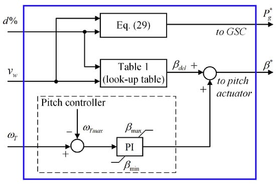 To minimize pitch control activation while retaining adequate reserve power, a new deloading (pitch-controlled) power reference curve is designed for wind speeds that fall between and . The required pitch angle () for each wind speed at deloading factor d is found by solving
