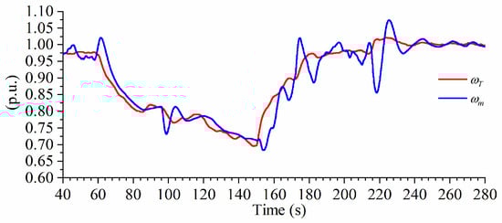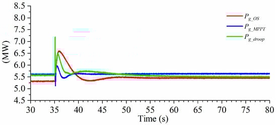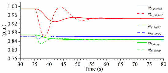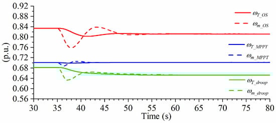 In this scenario, a constant and relatively low wind speed of 7.63 m/s (0.72 p.u.) is simulated, which is a relatively low wind speed. At this wind speed, the proposed control method operates the wind turbine in the over-speeding mode with the prescribed 10% power margin. The performance of the proposed method is then compared with the traditional MPPT method and the MPPT plus frequency droop method presented in [23]. In the MPPT method, the power reference from (4) is directly sent to the swing equation block of the VSG. In the MPPT plus frequency droop method, the power reference from (4) is supplemented by grid frequency droop control, as specified in [23]. The load is initially 9 MW, and then a sudden 5 MW load increment is introduced at t = 35 sec to evaluate dynamic performance. Figure 13 displays the wind turbine rotor’s angular speed () and the PMSG rotor’s mechanical angular speed () for the three methods.