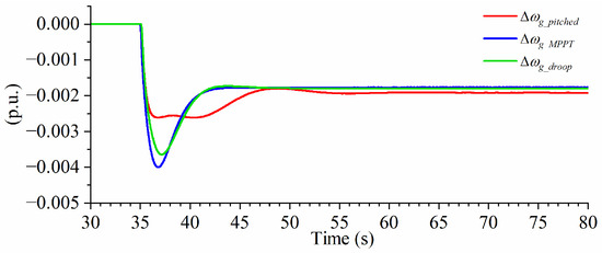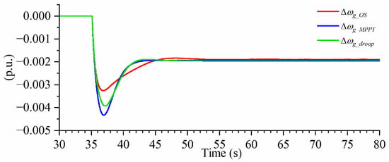 The grid angular frequencies of the three methods are also compared to assess their frequency regulation capabilities. Given their different initial operating conditions, only the angular frequency deviations from their initial values (0.99859 p.u. for the MPPT method, 0.99848 p.u. for the proposed method, and 0.99858 p.u. for the MPPT plus frequency droop method) are presented in Figure 14. Since the MPPT method does not contribute to primary frequency regulation, the grid frequency is solely regulated by the AC grid. Although the MPPT plus frequency droop method contributes to frequency regulation, its effectiveness is limited. This limitation arises because the power reference from the MPPT algorithm decreases as the rotor decelerates to release kinetic energy. Conversely, the proposed method enhances frequency support for the AC grid by arresting the frequency decline through a deloaded power reserve. This approach leads to a noticeable improvement in the grid frequency nadir by around 0.00062 p.u. (0.0372 Hz) compared with the MPPT plus frequency droop method. Additionally, the grid frequency recovers to a new steady state relatively closer to its initial steady state using the proposed method.