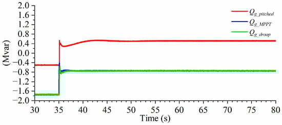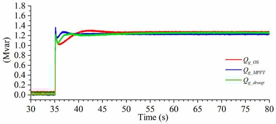Moreover, the reactive power outputs for all methods are compared in Figure 22. The reactive power outputs in the MPPT method and the MPPT plus frequency droop control method are similar and remain negative, indicating an above-nominal output voltage at the GSC terminal. The voltage regulation observed is similar to the under-excitation mode of conventional SGs.