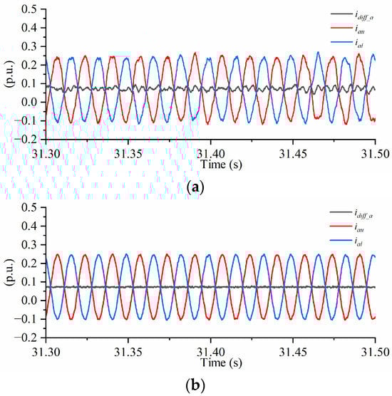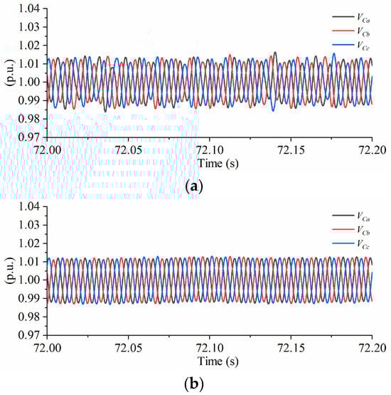 Since MMCs are used in both the MSC and GSC of the simulated system, ancillary controls are important for their efficient and stable operation. Figure 17 and Figure 18 compare the control performances of the proposed method before and after applying these ancillary controls. Taking the GSC as an example, Figure 17 shows the upper and lower arm currents, and , respectively, along with the circulating current component for phase leg a. It is clear that once the CCC is activated, there is a noticeable reduction in arm current distortion and the circulating current is effectively suppressed, showing a smoother DC component. In addition, the LVC enables the average SM capacitor voltages to be more evenly balanced across all three phases, as evidenced in Figure 18.
