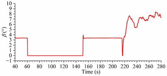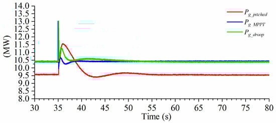 A relatively high wind speed of 9.43 m/s (0.89 p.u.) is simulated in this scenario, at which the pitched control is automatically activated. Correspondingly, the pitch angle reference is set to 3.3825° according to the offline look-up table. A comparison is still made with the other two methods under the same loading condition as in Section 4.1.1.