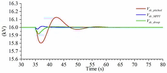 Figure 23 traces the progression of the DC-link voltage for all methods throughout the simulations. A greater fluctuation in for the proposed deloading method is caused by a larger instantaneous power imbalance between the MSC and the GSC. Furthermore, the comparison shows a more pronounced change in when comparing the MPPT plus frequency droop control method with the conventional MPPT method, which indicates the effect of integrating a frequency droop mechanism. These observations confirm that the DC-link voltages are well regulated in all methods, with the MSC dynamically adjusting the electromagnetic torque of the PMSG.
