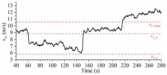 In order to further evaluate the dynamical performance of the proposed hybrid deloading approach in a practical setting, a varying wind speed scenario is designed. Figure 24 shows a time series of offshore wind speeds sampled at 2 Hz. A dynamic load is simulated with a base load of 10 MW, and a step load of 6 MW is connected at t = 96 sec and disconnected at t = 172 s. In this scenario, the angular speeds of the wind turbine and PMSG rotors are shown in Figure 25.