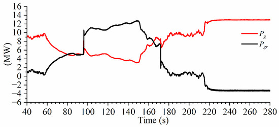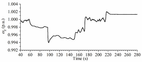 It is clearly demonstrated that when the step load is connected at t = 96 sec, the WECS operating in the over-speeding mode is able to assist the grid in arresting the grid frequency decline. In addition, when the step load is disconnected at t = 172 sec, the WECS in the pitch-controlled mode adjusts its active power output to help the AC grid counter the grid frequency rise. When the turbine rotor speed rises beyond the maximum allowable value after t = 216.4 s, the pitch controller is activated to regulate the rotor speed. Concurrently, the WECS starts to follow a deloaded constant active power reference, as shown in Figure 27. The simulation results demonstrate the smooth operational transitions facilitated by the proposed method.