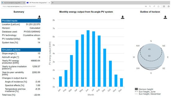 A photovoltaic system located in the Lublin Voivodeship was selected for research under Polish geographical and climatic conditions. It is worth emphasizing that it has the best sunshine in Poland. The intensity of solar radiation is, of course, different in individual regions of Poland and ranges from 900 kWh/m2 to 1200 kWh/m2. In order to determine the properties of a photovoltaic system mounted on a roof and located in Poland, in the specific city of Lublin, the above-mentioned Internet platform was used. It is based on a database of installations from various European countries. It allows you to generate the properties of a photovoltaic system connected to the power grid and export data in the form of charts or in csv format. The platform allows you to generate the performance of a photovoltaic system with a specific peak power, taking the following into account: