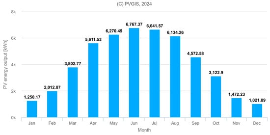 The results obtained from the Internet platform allow for a preliminary estimate of the amount of energy produced by a photovoltaic system with specific power and design parameters located in a specific geographical context. However, based on the results presented in Figure 2, it can be clearly stated that the amount of energy produced per month varies significantly depending on the month of production, i.e., on the seasonality of the seasons.