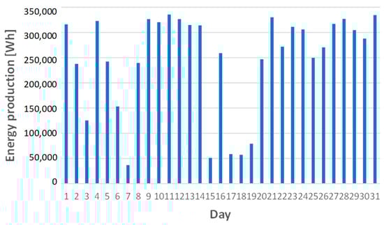 Much more information than the monthly energy production by the photovoltaic system is provided by the amount of energy produced on individual days of the month. The month with the highest energy production can be used to determine the maximum daily amount of energy produced. As we can see in Figure 4, a 50 kWh system is able to produce over 300,000 Wh or 300 kWh per day.