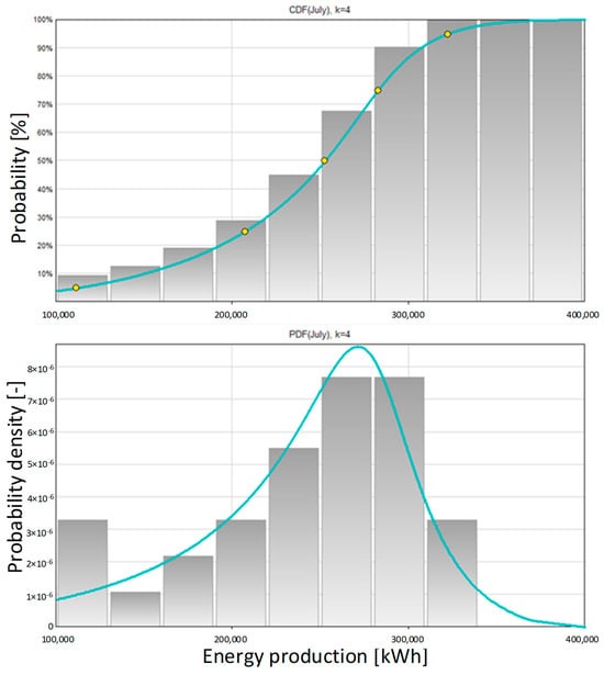 In Polish geographical and climatic conditions, and taking into account the specific location context of the analyzed photovoltaic system, similar results were obtained for subsequent months of system operation. Figure 6 presents CDF and PDF for the energy produced by a 50 kWp photovoltaic installation in July 2023. The monthly energy production then amounted to 7.5 MWh. Expert analysis of the PDF provides information about the high density of the probability distribution in the range of large amounts of energy produced daily, ranging from 200 to over 300 kWh. However, the owner of a strategic model using the Metalog family of probability distributions and the previously mentioned GeNIe 4.1 Academic program does not have to have knowledge of the nuances of producing electricity from renewable energy sources; the owner can directly ask the knowledge base about the probability of producing a certain amount of energy in a given month.