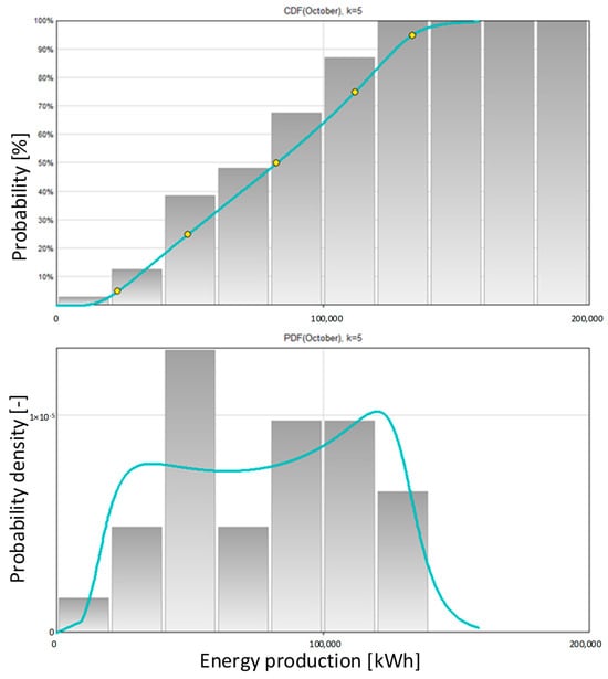 The GeNIe 4.0 Academic software allows you to determine the cumulative distribution function (CDF) and probability density function (PDF) for various k coefficients (Figure 5). The probability density function plot shows that high probability densities occur for large daily amounts of energy generated. Therefore, in the spring months in Polish geographical and climatic conditions, we can expect favorable conditions for the production of large amounts of energy despite the still-short days. According to the authors, low air temperature has a very large impact on the production of the largest amount of energy of the year in May. In summer months such as June, July and August, the sun is higher above the horizon and shines much longer, but at much higher daily temperatures, which negatively affects the amount of energy produced.