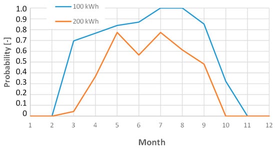 Using the strategic model for charging electric vehicles from renewable energy sources described in the previous sections, graphs of the probability of generating a daily amount of energy of more than 100 and 200 kWh in the individual months of 2023 were calculated and are presented in Figure 8. From the calculated probability values, it can be concluded that in Polish geographical climatic conditions, significant amounts of electricity can be generated from a photovoltaic system with a peak power of 50 kWp. The input data for creating the strategic model comes from a specific photovoltaic system installed on the roof of an institutional building in the city of Lublin, Poland. Thus, the model includes geographic context. The strategic model also includes the engineering context related to the type, azimuth, and inclination angle of the installed photovoltaic panels. In this complex context, a photovoltaic system is able to generate an amount of energy greater than 100 kWh every day between March and September with a high probability of over 0.7. In the months from May to September, it is able to generate amounts of energy greater than 200 kWh but with a probability of over 0.5. In the following months, from November to January, the system is unable to generate a daily amount of energy produced greater than 100 kWh. In the autumn and winter months, the amounts of energy produced daily are too small to charge the batteries of the vehicle fleet. Based on the strategic model in question, the vehicle fleet charging manager is able to calculate the probability of the photovoltaic system producing specific amounts of electricity and initially determine the share of green energy in the total energy mix needed to charge the vehicle fleet.