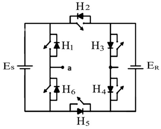 Researchers are contributing to design topologies to reduce the switch count in MLIs for better utilization of such inverters and higher efficiency. The classification of these topologies in terms of the structure and selection, for medium power inverters and for PV energy system applications, has been a valuable consideration in recent decades. A basic unit in the proposed three-phase inverter topology is based on a basic unit reported by [19], and in recent times it is known as a hexagonal switch cell (HSC), as shown in Figure 1. An extended HSC unit with four DC sources, as reported by [20], is shown in Figure 2. The topology has the merits of a simplified structure. The maximum output voltage is (ES2 + ER2) and the minimum output voltage is −(ES2 + ER2). This topology can easily be extended to include a higher number of levels. It only requires unidirectional switches. ES1 and ER1 cannot be switched on together as an addition or subtraction. The same applies to ES2 and ER2. By selecting ES1 = Vdc, ES2 = 5Vdc, ER1 = 2Vdc, and ER2 = 10Vdc, a 31-level output voltage can be produced.