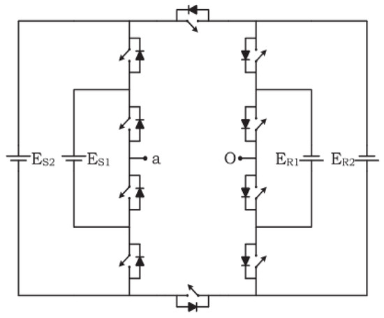 The first circuit is a three-phase inverter, as shown in Figure 5b, which consists of a three star-connected single-phase inverter. There are 30 insulated gate bipolar transistors (IGBTs) with diodes and 12 DC sources. The output terminals of the three-phase inverter are points (+A, +B, and +C), while points (−A, −B, and −C) are connected to form the neutral point in the star connection.