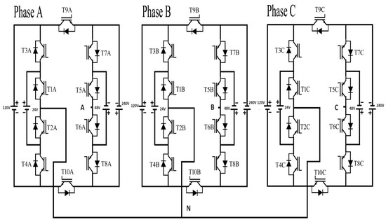 The proposed topology for the three-phase MLI with a reduced number of switches consists of 10 switches (MOSFETs or IGBTs) and 4 DC sources for each single phase, resulting in a total of 30 switches and 12 DC sources for the three-phase implementation, as shown in Figure 3.