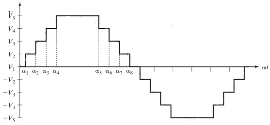 To illustrate the principle of fabricating the multilevel inverter output, Figure 4 presents the output voltage of a nine-level inverter with four angles (. These angles are determined by solving trigonometric equations resulting from a Fourier analysis of the output voltage of the inverter. The Fourier series of a staircase periodic function can be expressed [24] as follows: