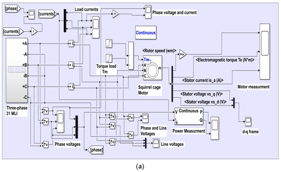 The proposed three-phase, 31-level MLI was built and simulated using the MATLAB Simulink software version R2019a, using the optimized angles provided in Table 1. The three single-phase inverters are Y-connected to form a three-phase 50 Hz AC supply source, as shown in Figure 3. Each phase has 10 power switches (IGBTs) and 4 DC sources. The IGBTs work in complementary mode. Switches T2, T4, T6, T8, and T10 complement T1, T3, T5, T7, and T9, respectively. A voltage of VDC = 24 V is used for each staircase level. The other three DC sources are 2VDC = 48 V, 5VDC = 120 V, and 10VDC = 240 V. To generate 31 levels in the inverter output voltage, multiple paths are chosen for the electrical current to pass through the power switches. Here, several DC sources are used; either adding them together, subtracting them from each other, or using individual sources. The peak output phase voltage = 15 (level) × 24 V (one staircase voltage) = 360 V. The peak line voltage = 580 V and VL(RMS) = 410 V. The three-phase induction motor specifications used for the simulation are as follows: squirrel cage (5.4 HP, 4 KW, 50 Hz, 1430 RPM). The Simulink model of the 31-level, three-phase MLI connected to a three-phase squirrel cage induction motor load is shown in Figure 5a. The block diagram consists of three main circuits, each of which has devices attached to measure the voltage, current, and other variables.