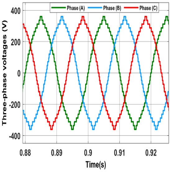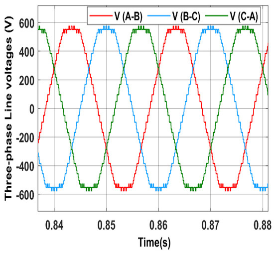 The three-phase output and line voltages for the 31-level MLI are shown in Figure 7 and Figure 8, respectively.