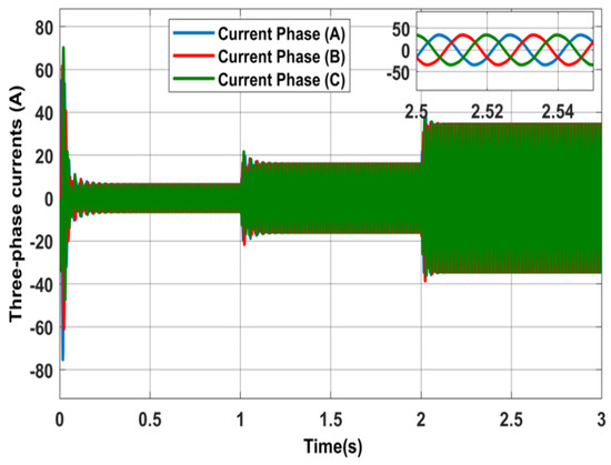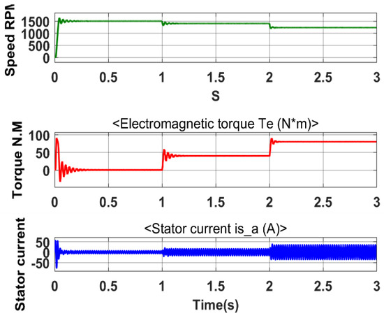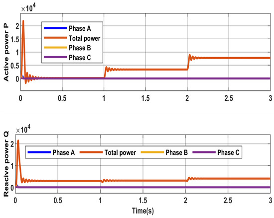 Figure 11 shows the measurements for the three-phase squirrel cage induction motor, consisting of the motor speed, electromagnetic torque, and stator current. The motor reaches the base speed of about 1500 rpm at no load. This speed is then reduced because of the external load applied at an instance between 1 s and 2 s. The stator current increases from no load to higher values to reflect the load torque applied. The power consumed consists of active power, P, and reactive power, Q, as shown in Figure 12.