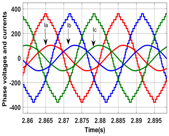 The phase currents supplied by the 31-level MLI to the induction motor are shown in Figure 9. The current from 0 to 1 sec is about 4.25 A (rms) when the motor is operating at no load. When the motor is subjected to an external 20 Nm load at an instance from 1 s to 2 s, the current increases to 11.3 A (rms). Finally, from 2 s to 3 s, the current increases to about 24 A (rms), when the motor is subjected to a 40 Nm load. Figure 10 shows a phase shift of about 36° between the supply voltage and the current, indicating a lagging power factor of 0.81.