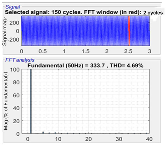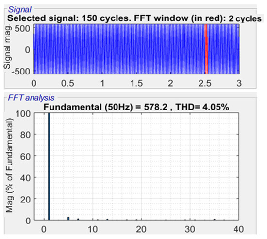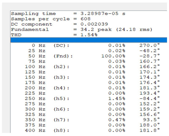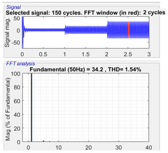 The fast Fourier transform toolbox in the MATLAB software revealed that the harmonic content in the inverter’s phase voltage is relatively low; the total harmonic distortion THD is about 4.69%, and the recorded value of the line voltage THD is 4.05%, as shown in Figure 13 and Figure 14, respectively. The motor is considered to be an inductive load that filters some harmonics, resulting in a low harmonic distortion THD of 1.54% for the motor current, as shown in Figure 15. Figure 16 shows values for the DC component = 0.002039 and some of the harmonic contents, which have low values compared to the fundamental 50 Hz component.