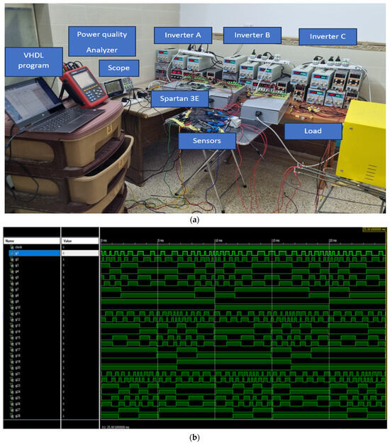 The Spartan 3E controller is used as the processor unit in the experiment. The clock frequency of the controller is 50 MHz; therefore, the period of each clock is 20 ns. To cover one 50 Hz AC supply cycle at the inverter output, a total of 20 ms/20 ns = 1,000,000 clocks linked to the Spartan 3E controller are required. A prototype of the proposed three-phase, 31-level MLI is designed and built, as shown in Figure 17a. The operation of 30 switches is programmed using the Spartan 3E controller through writing a program in the VHDL language, then running a simulation such that the appropriate pulses can operate the switches. The simulated pulses for one cycle of operation are shown in Figure 17b.