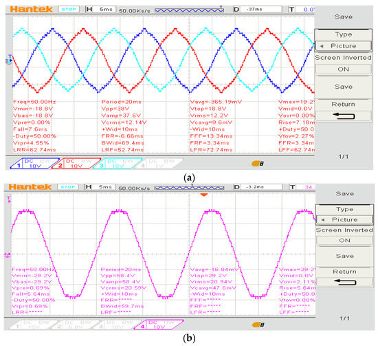 The system is operated at no load to monitor the phase and line voltage. Figure 19a shows the three-phase output voltage at 50 Hz and 122 Vrms. The line voltage (Vab) is shown in Figure 19b at 50 Hz and 210 Vrms.