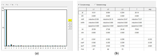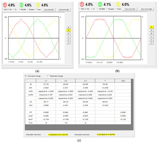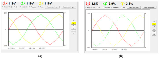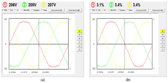 The power and quality analyzer HZCR-5000 is used to record the results. The three-phase voltage, THDs, and phase shift between the phases are shown in Figure 20a, and Figure 20b respectively.