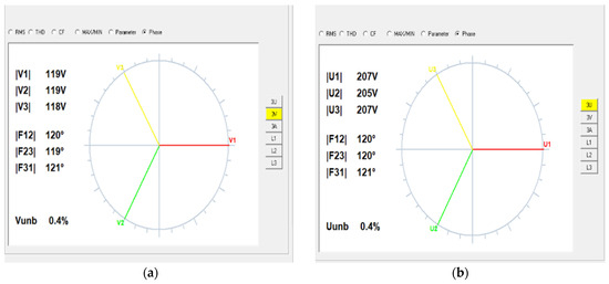 The phase shifts between the three-phase and the three-line voltage are shown in Figure 22a and Figure 22b, respectively. The voltage unbalance is very low and about 0.4%.