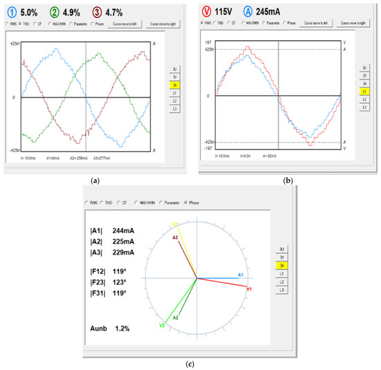 The three phase currents in Figure 24a have an average THD value below 5%, which is compatible with the respective voltage values. The relationship between the phase voltage and current in the Phase A supply is shown in Figure 24b. The other phases responded with very similar characteristics. Figure 24c shows the phase difference between the three phase currents. Although the load is resistive, there is a small value difference in the phase between the voltage and current, which is normal in practical work. The voltage unbalance is recorded as 1.2%, which is a low value.