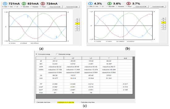 Phase current results for a resistive load: (a) phase currents (THDs) for a resistive load, (b) voltage–current relationship, (c) phase shift between the phase currents.
