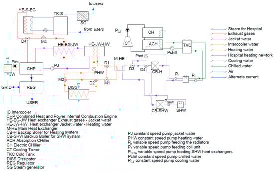 Figure 1 shows the layout of the existing cogeneration plant based on a reciprocating cogeneration engine, providing thermal and electric energy to a hospital. Here, for the sake of clarity, a brief description of the existing layout is provided. Note that a detailed description of the existing layout is available in Ref. [25]. The high-temperature thermal energy provided by the CHP, i.e., the exhaust gases stream (EG), is first used to produce steam. In particular, the stream of exhaust gases (EG) is supplied to the heat exchanger HE-S-EG (Figure 1), where the steam is produced by exploiting the waste heat of EG. When the steam demand is null or the temperature of the EG leaving the heat exchanger HE-S-EG (Figure 1) is higher than 140 °C, the EG are delivered to the heat exchanger HE-JW-EG (Figure 1). Here, the exhaust gases stream supplies heat to the jacket water loop. When the high-temperature thermal energy, i.e., the thermal energy due to exhaust gases, provided by CHP is not sufficient to meet the hospital’s steam demand, an auxiliary steam generator (SG Figure 1) is activated. The low-temperature thermal energy provided by the CHP is used to meet the building space heating, building space cooling, and sanitary hot water (SHW) thermal energy demands. In particular, the thermal energy recovered from the CHP is discharged to the heating water loop by means of the main heat exchanger (M-HE Figure 1). The hospital heating network water (Figure 1) delivers thermal energy to the heating terminals installed in each thermal zone and to the heat exchangers producing sanitary water. Note that two auxiliary boilers are considered backup systems. The thermal energy produced by CHP is also used for driving an absorption chiller (ACH). When the thermal energy available to drive ACH is not sufficient or null, an auxiliary electric-driven chiller (CH) is activated to balance the hospital building space cooling energy demand. Then, the ACH and CH cool down the chilled water network, which feeds the cooling terminal installed in the hospital, as shown in Figure 1. A cooling tower dissipates the waste heat discharged from the absorption chiller condenser and the electric chiller condenser. Note that the thermal energy is primarily used for building space heating and SHW production.