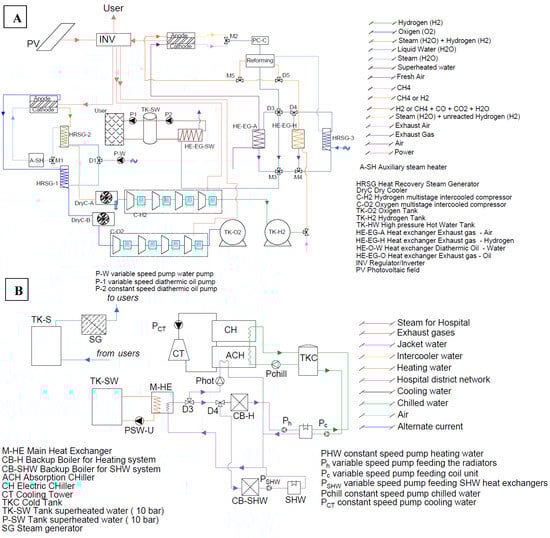 Proposed layout based on a reversible solid oxide fuel cell operating in cogeneration mode: (A) Reversible SOFC plant layout; (B) Layout of the hospital heating and cooling network driven by the superheated water.