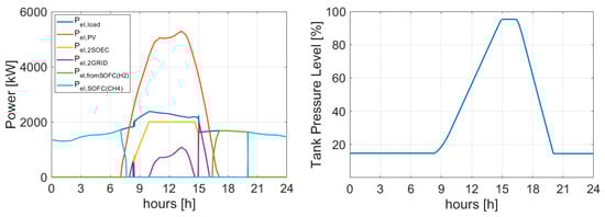 Dynamic results: power flows and pressure level of the hydrogen tank.