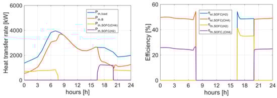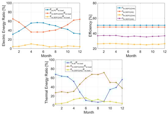 Concerning the thermal energy performance of the proposed plant, considering that the PV power production directly matches the hospital power load during the central part of the day, the activation of the auxiliary boilers and steam generator compared with the reference system increases; see Figure 4. Moreover, when the SOFC is driven using the methane withdrawn from the grid, a share of the thermal energy produced by the cell is used to run the steam methane reformer (SMR) and produce the steam to be delivered to the SMR in order to produce hydrogen from methane. Then, the available thermal energy is lower compared with the one provided by the SOFC, which is directly fueled by hydrogen or conventional CHP. In fact, when steam methane reform is in operation, the thermal efficiency is lower. For example, from 16:00 to 17:00, when SOFC exploits the green hydrogen, ηth is roughly equal to 38%, whereas from 17:00, when the SOFC is supplied by the hydrogen produced by means of SMR, ηth is equal to 26%; see Figure 4. For these reasons, the thermal energy supplied by the hospital boiler Eth,B passes from 2.60 GWh/y (RS) to 3.96 GWh/y (PS). Figure 5 confirms these trends on a monthly basis. It is worth noting that the electrical efficiency of the SOFC is lower when the cell uses hydrogen, i.e., ηel,SOFC(H2) = 48% vs. ηel,SOFC(CH4) = 51% (Table 4). This result is due to the fact that the cell fed by methane operates for a longer time at a partial load. In fact, the cell’s electric efficiency increases as the cell load decreases. In particular, the cell fed by methane mainly operates during the evening and night, when the PV power production is null and the green hydrogen is not available. During these hours, the electric load of the hospital is lower compared to the central part of the day when hospital activities are at capacity. In conclusion, Figure 5 confirms the advantages of the proposed plant with respect to the conventional power plant. In fact, the thermal energy demand of the hospital is at a minimum during the summer season, when solar production is at its maximum. During the central part of a typical day, the PV power production directly matches the hospital power load, and the surplus electricity is supplied to SOFC operating in an electrolyzer mode, while the thermal load of the hospital is met by the auxiliary system burning fossil methane. However, during the summer season, when PV production is greater, the increase in thermal energy provided by the auxiliary system is limited because of the limited demand for heating energy. In fact, according to Figure 5, the thermal energy provided by the SOFC fed by methane matches the larger part of the user’s thermal energy demand, i.e., more than 60% from May to September. Moreover, during this period, the share of thermal energy matched by the auxiliary boilers is minimal, i.e., lower than 8%. At the same time, renewable electricity matches more than 70% of the hospital demand from May to September. In addition, during these months, the cooling demand of the hospital is mainly matched by the electric chiller driven by the renewable electricity produced by the PV field.