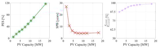 Figure 6 displays the results of the PV field capacity as varied. As expected, the increase in the PV capacity leads to an improvement in the energy performance of the whole plant; the PES grows as the PV capacity increases. In fact, when the PV capacity is equal to 12.00 MW, the PES achieves a value of 71%; see Figure 6. The minimum SPB is achieved for a PV capacity of 9.00 MW. After this value, as the PV capacity increases, the SPB slightly decreases. This result is due to the fact that when the PV capacity increases from 1.50 MW to 9.00 MW, the self-consumed electricity (Eel,Self) significantly increases, passing from 87% to 97%. A further increase in the PV capacity leads to a negligible increase in the self-consumed energy. This means that a PV of 9.00 MW is able to meet almost all of the electricity demands of the selected user. Then, as the PV capacity increases from 9.00 MW, the increases in the capital cost due to the larger PV field are not balanced by the consequential benefits due to the further renewable production.