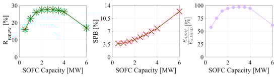 Figure 7 displays the results achieved by varying the capacity of the reversible fuel cell. As the cell capacity varies, the Rrenew index increases, reaching the maximum value of 27.60% for an r-SOFC capacity of 2.50 MW. Note that when the capacity of the reversible fuel cell approaches 2.00 MW, the Rrenew index is quite stable at around 27.50%; see Figure 7. These results rely on the fact that the increase in cell capacity allows the system to maximize the use of the PV renewable electricity, producing green hydrogen. However, as shown in Figure 3, when the capacity of the cell is equal to 2.00 MW, the surplus renewable electricity not used and delivered to the grid is limited. Therefore, a further increase in the cell capacity from 2.50 MW does not lead to a significant increase in renewable hydrogen production. For these reasons, from 2.00 MW to 3.50 MW, the Rrenew index is quite stable; see Figure 7. However, as the cell capacity rises beyond 4.00 MW, the Rrenew index dramatically worsens. This result relies on the minimum activation power needed to drive the cell; this power is assumed to be equal to 30% of the cell’s rated capacity [46,76,79,80,81]. Therefore, when the capacity of the cell is 6.00 MW, the electricity delivered to the cell is reduced. This trend is also clearly explained in Figure 7. In fact, when the capacity rises beyond 4.00 MW, the share of the load met by the self-produced electricity (Eel,self) dramatically falls; see Figure 7.