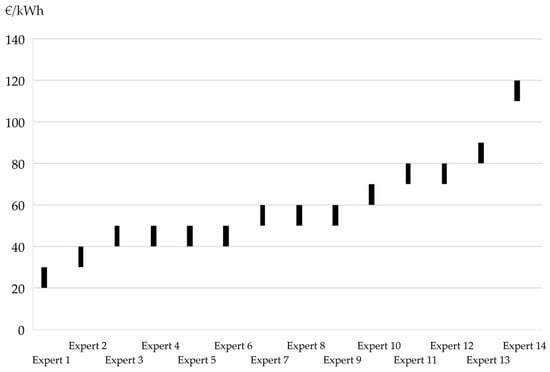 Regarding the individuality of battery systems, experts highlighted that determining the battery’s condition and the potential returns from the repurposing scenario cannot be universally quantified. Instead, these factors must be assessed on an individual basis due to the distinct characteristics of each battery system. As for the market price, there was disagreement among the experts. The market price of aged battery systems was estimated by the experts to be between 30 and 120 EUR/kWh as presented in Figure 4. Also, Figure 5 represents an updated survey of 2024. Both figures indicate the presence of only imprecise data in this regard. In Table 2, the main findings of the second industry study are presented.