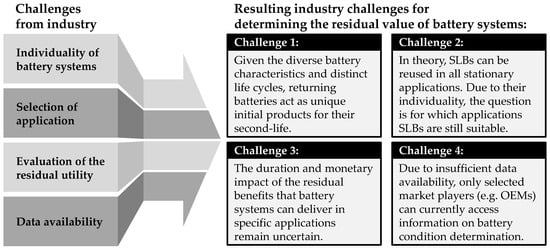 Overall, four main challenges for the industry could be derived, which are shown in Figure 6. The first challenge arises from the diverse battery characteristics and individual life cycles, so SLBs must be treated as individual new products. This means that each SLB has unique characteristics, whether in terms of its size, capacity, condition, or age. This individual aging depending on various factors is illustrated in Figure 3. As these batteries show different signs of use and wear, their integration into second-life applications requires a tailored approach. In other words, they need to be individually assessed, tested, and adapted to ensure that they can be used efficiently and reliably in new applications. The second challenge is the selection of a suitable second-life application. Although the second industry study identified SLB repurposing as particularly useful for frequency regulation and increasing PV self-consumption, the question of repurposing scenario still needs to be clarified on its own due to the individuality of each battery system. Determining the residual value of battery systems is another challenge for the industry. This is made particularly difficult by the unknown possible service life and the different areas of application of SLB. Finally, insufficient data availability is also a direct challenge for the industry. This barrier can only be removed if the original equipment manufacturer (OEM) is directly involved in the rededication process. From 2027, most batteries in the European Union will require a battery passport [26], offering details on their lifecycle, usage, and recycling advice to enhance transparency for all stakeholders.