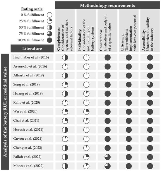 In order to prove whether the identified practice deficit is still relevant, i.e., whether it has not yet been resolved by research results on the theoretical path, a literature review was carried out to compare scientific research articles with the identified deficit based on their content and results. The selection of publications was limited to thematically appropriate content that either aimed to quantify the residual value of aged traction batteries or to carry out a price evaluation for these storages. In addition, a degree of fulfillment was defined based on five content-related requirements to assess the extent to which the practical deficit has already been solved. Finally, a proposal was formulated for solving the practical deficit, enabling the industry to overcome the challenges in future.