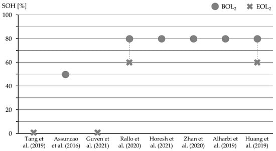 SOH values for BOL2 and EOL2 according to different studies [28,29,31,32,35,36].