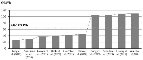 Estimated SLB cost according to different studies in [Euro/kWh] [28,29,30,31,32,33,35,36].